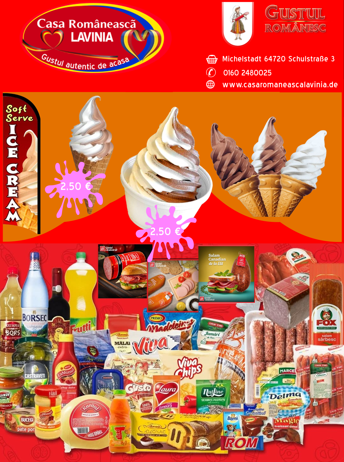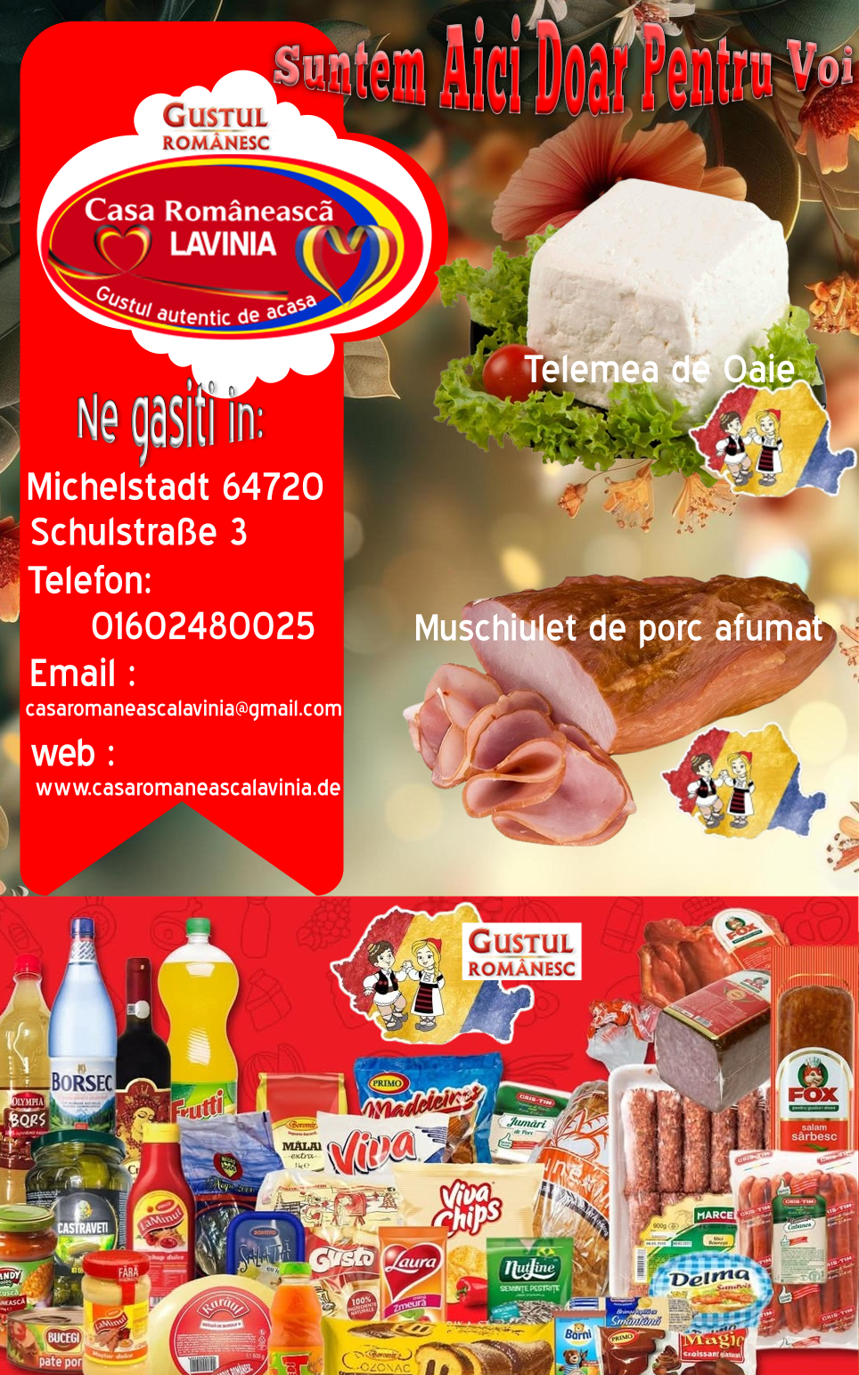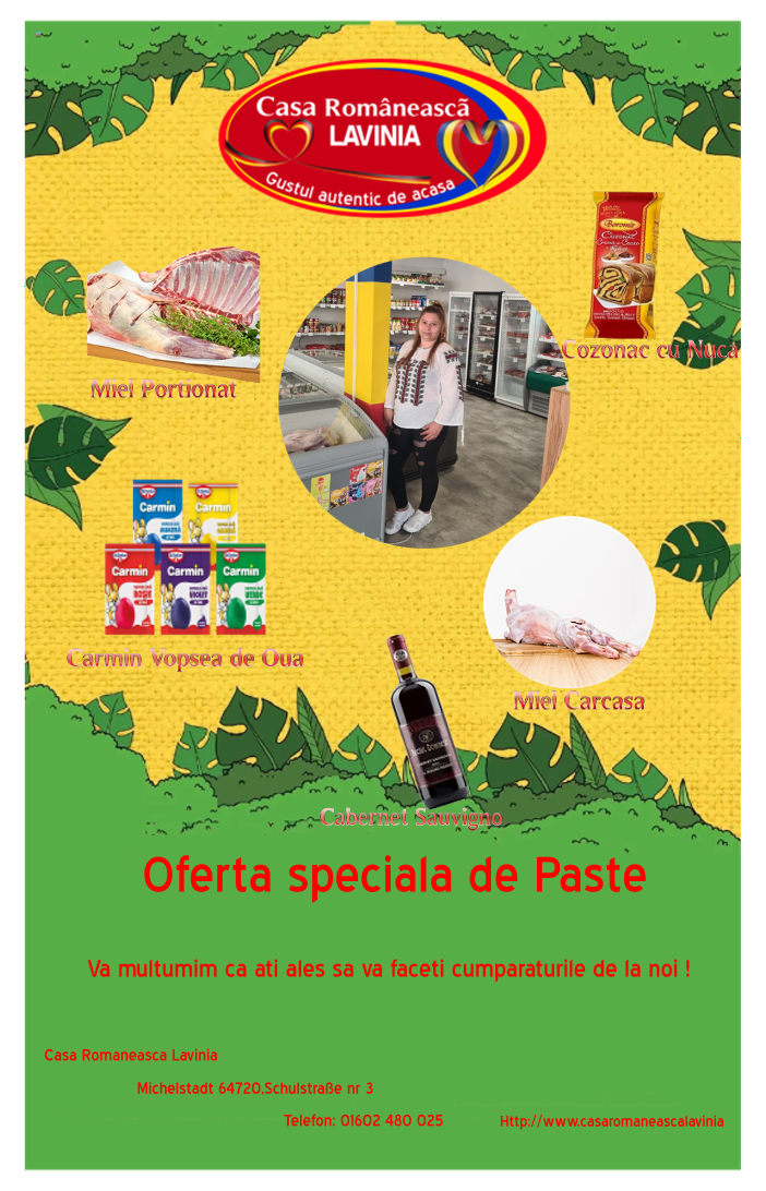 Casa Românească Lavinia este un Magazin tradițional cu produse specific Românești situat în Orășelul Michelstadt din Germania. Dorim să oferim clienților noștri o gamă cât mai diversificată de produse românești cu gust autentic,de care multora dintre cei aflați departe de casă le este dor.